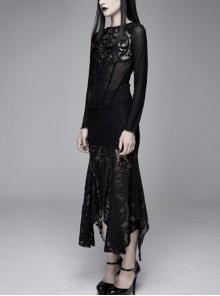 Gothic Style Elastic Printed Knitted Irregular Hem Low Cut Hollow Lace Black Long Sleeved Lace Dress$65.90$101.4035%