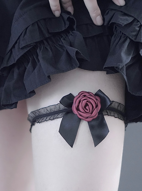 Black lace leg rings, satin bow, and three-dimensional red rose decoration.