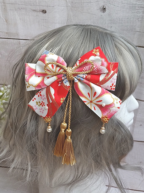 Japanese Style Big Bowknot Sakura Hot Stamping Process Lace Up Pearl Tassel Bowknot Headdress Hairpin