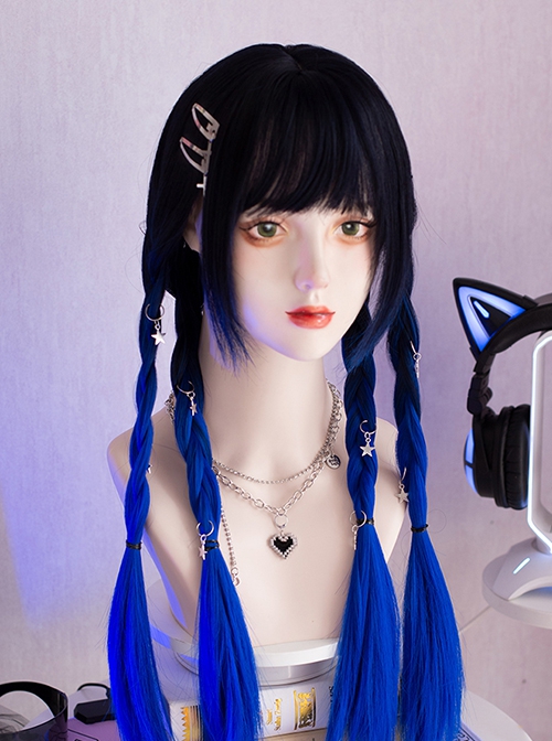 Black and blue gradient long straight wig, handsome and fashionable, Klein blue is very fashionable, sweet and cool hot girl style.