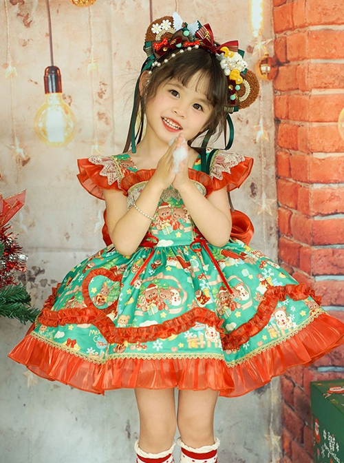 Cute ruffled sleeves, bear Christmas print, back bowknot decorate, large ruffled hem, full of Christmas atmosphere