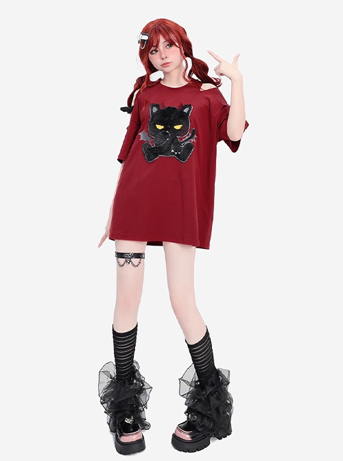 Little Devil Cat Series Cute Flocked Cat Pattern Sweet Cool Off Shoulder Kawaii Fashion Red Short Sleeves T-Shirt