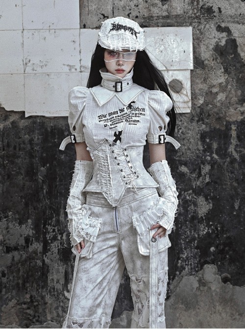 Madhouse Series Subculture White Gothic Punk Suede Ripped Asymmetric Fishbone Corset Waistband