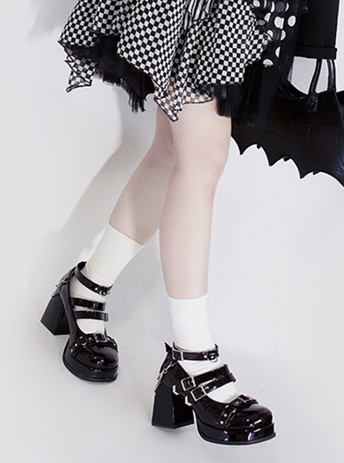 Metal Button Straps Elegant Punk Retro Silver Chain Gothic Lolita Round Toe High Heel Thick Sole Mary Jane Shoes