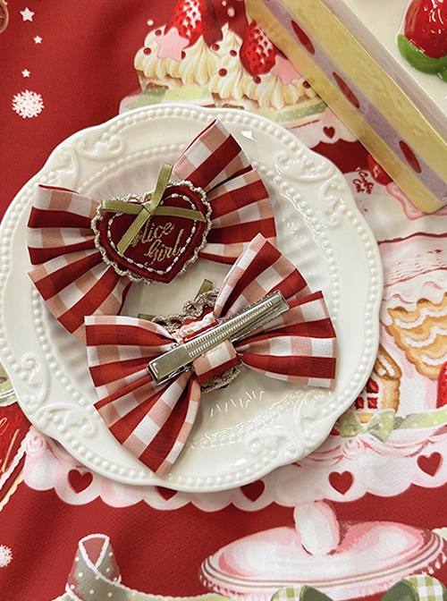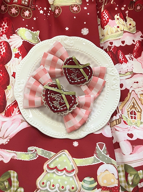 Mint Strawberry Series Sweet Lolita Cute Plaid Ribbon Bowknot Heart Shape Lace Embroidery Hairpin Side Clip