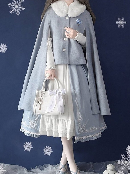 Miss Leisha Series Elegant Retro Haze Blue With White Fur Collar Autumn Winter Warm Classic Lolita Cloak