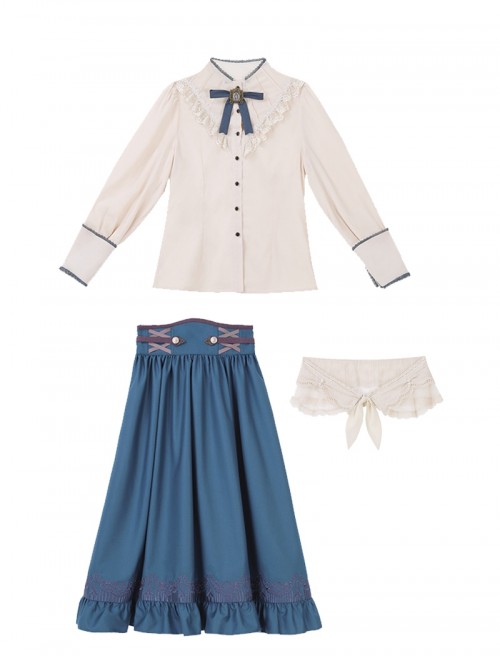 This Nameless Elegy Classic Lolita set features a beautifully crafted long-sleeve blouse, delicate lace shawl, and elegant dark blue skirt, embodying exquisite British style.