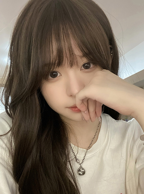 Natural dark brown long curly hair with very fluffy bangs, suitable for daily commuting and suitable for various combinations.