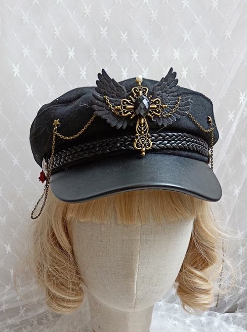 Ouji Fashion Handmade Autumn Winter Dark Black Gothic Cross Wings Military Style Lolita Beret Postman Hat