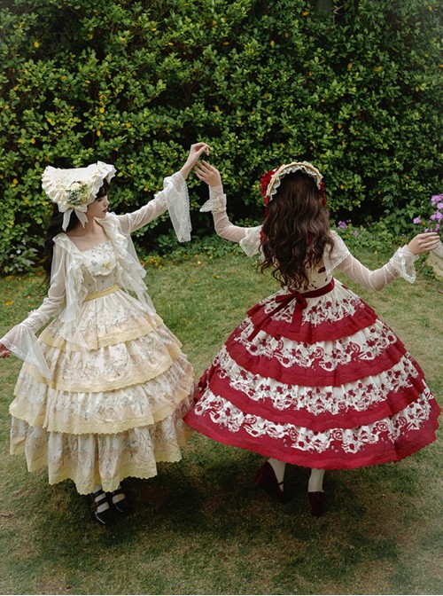 This elegant Classic Lolita dress features a floral print, multi-layered ruffles, and a high waist design, perfect for a sophisticated look.