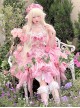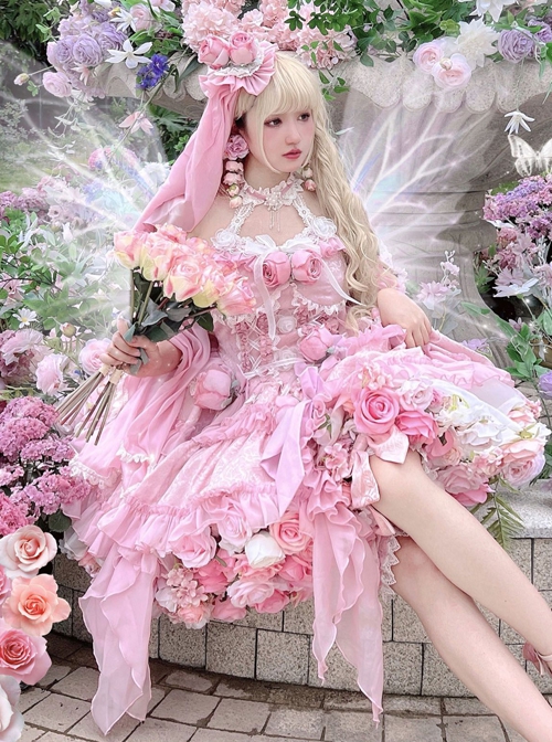 Pink Three-Dimensional Rose Bowknot Jacquard Lace Halter Design Sweet Lolita Sleeveless Dress