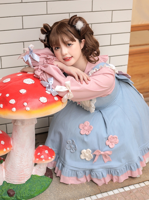 Plum Flower Snow Rabbit Series Sweet Lolita Blue Pink Plum Flower Bowknot Decoration Long Sleeve Shirt Sleeveless Dress Set
