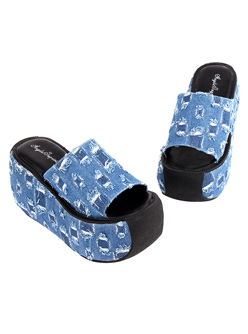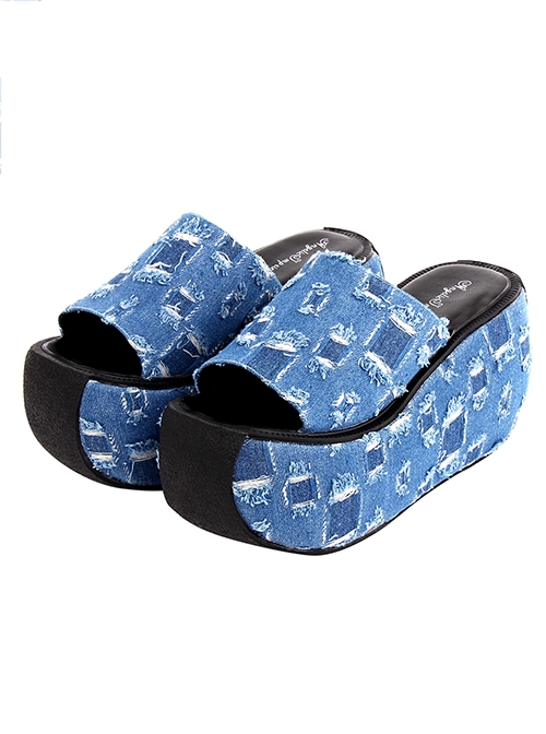Punk Lolita Summer Daily Blue Denim Hole Thick Bottom Non-Slip Slip-On High-Heeled Sandals