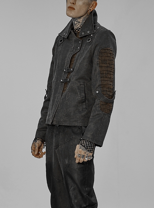 Punk Style Asymmetrical High Collar Design Cool Metal Rivet Side Ring Decoration Gray Brown Long Sleeves Jacket