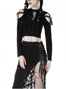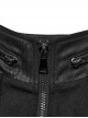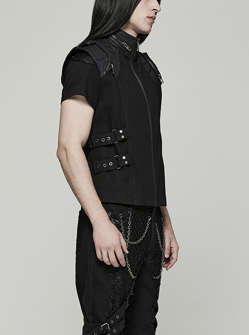 Punk Style Cool Stand Collar Shiny Twill Splicing Metal Rivet Zipper Side Waist Webbing Decorative Black Vest