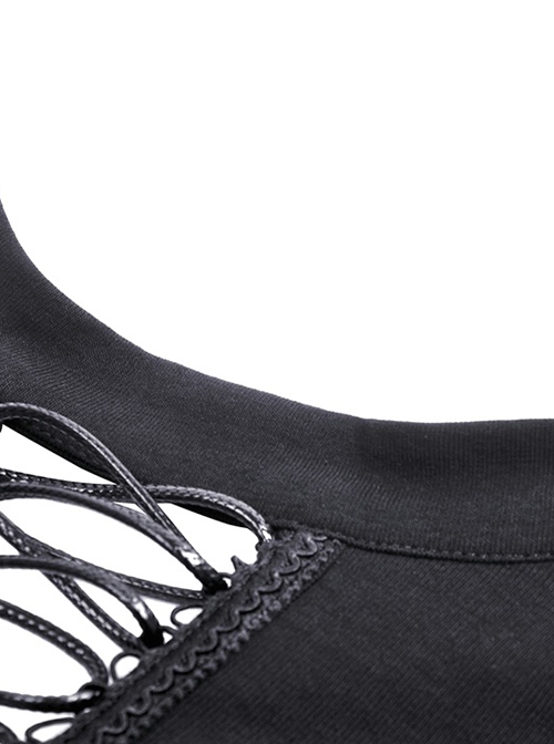 Punk Style Cross Leather Strap V Shaped Chest Hollow Sexy Off Shoulder Metal Buckle Black Long Sleeves T Shirt