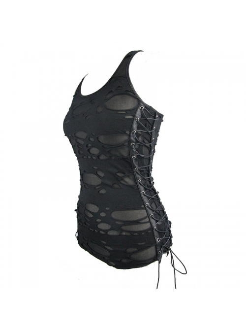Punk Style Elastic Hole Fabric Waist Side Eyelet Tie Rope Design Black Sexy Backless Daily Vest