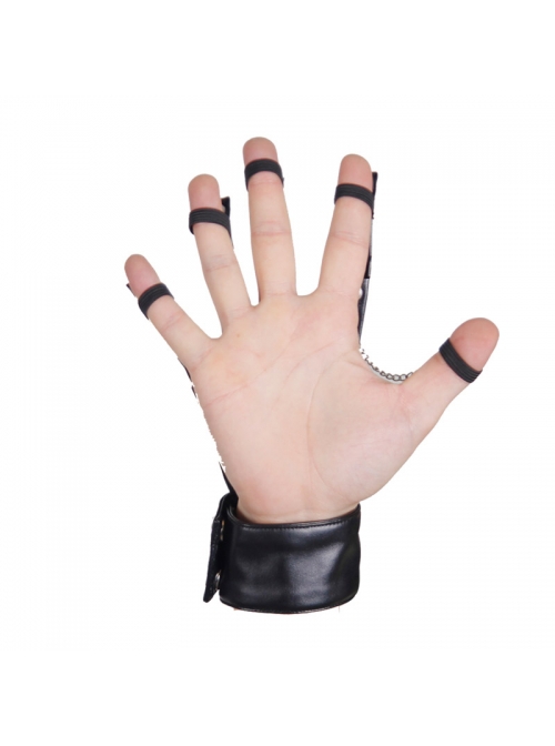 The whole bracelet is made of black leather. The main phalanx is pointed out with rivets on the Joint position and connected with chains. The fingertip is nailed with small ghost head rivets and the wrist is decorated with big ghost head rivets.