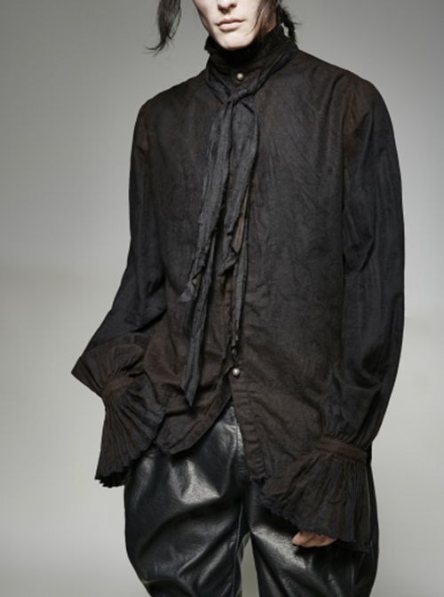 Punk Style High Collar Burrs Edge Retro Metal Buttons Old Effect Ruffled Bow Tie Black Lantern Sleeves Shirt