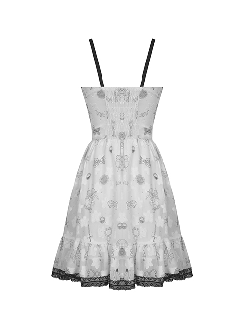Punk Style Multi-Layered Lace Ruffles On The Chest Unique Print Decoration White Sexy Suspender Dress