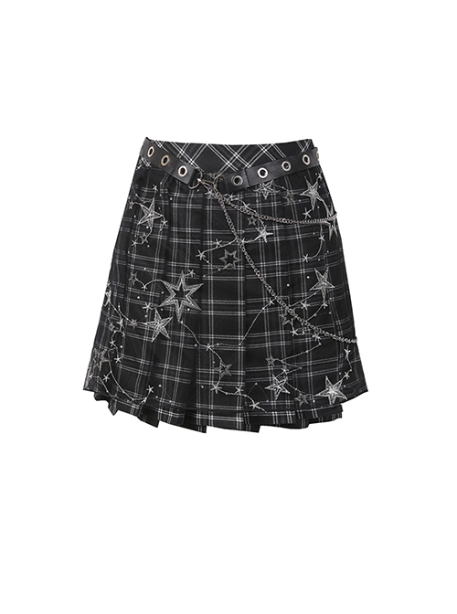 Punk Style Personalized Star Embroidered Leather Belt Metal Chain Embellished Black Plaid Pleated Skirt