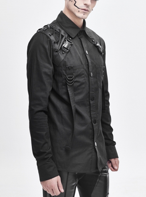 Punk Style Simple Solid Color Shoulder Eyelet Tie Rope Asymmetric Design Black Long Sleeve Metal Button Shirt