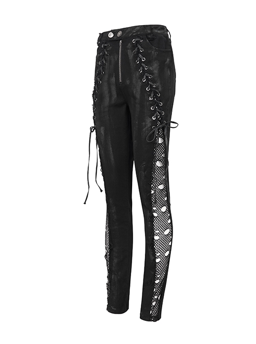 Punk Style Slim Fit Elastic Side Mesh Splicing Twill Fabric Front Center Cross Laces Embellished Black Washed Trousers