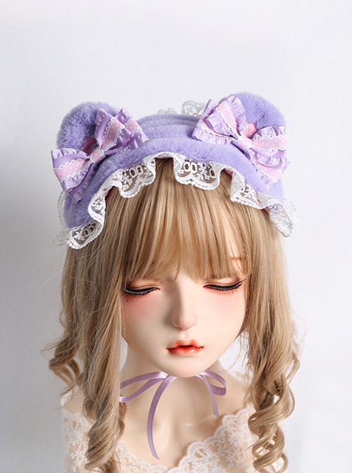 Pure Color Polka Dot Bowknot Lace Decoration Cute Plush Bear Ears Sweet Lolita Headband