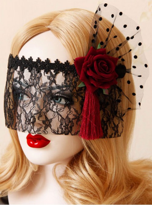 Red Flower Red Tassel Black Lace Veil Half Face Gothic Lolita Mask