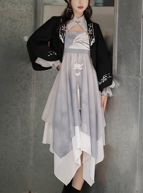 Retro Chinese Style Hanfu Improved Han Element Embroidery Stand Collar Irregular Hem Fringed Decorative Design Long Sleeve Dress Suit
