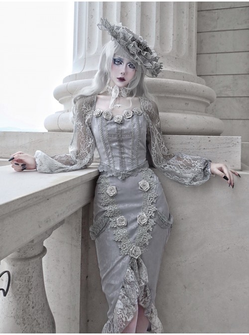 Rose Funeral Series White Gothic Dirty Dyed Lace Fishbone Jacquard Gray Lantern Sleeve Top