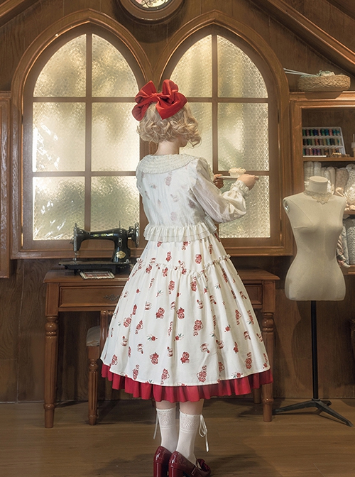Apricot lace cardigan, small bow ruffle baby collar, cute lantern sleeves, and a gorgeous ruffle at the cuffs and hem. The cardigan is very light and slightly see-through, making it suitable for spring and summer wear.