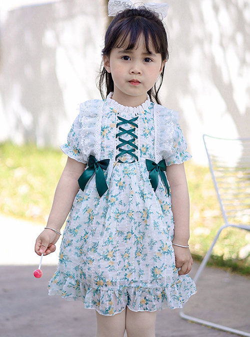 Simple Small Flower Decoration Green Cross Tie Bow Knots Classic Lolita Kid Dress