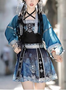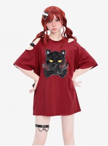 A cute cartoon fairytale style pullover sweater with a contrasting dark blue doll collar and burgundy sweater ruffled loose lantern sleeves and a cartoon Snow White illustration in the middle.