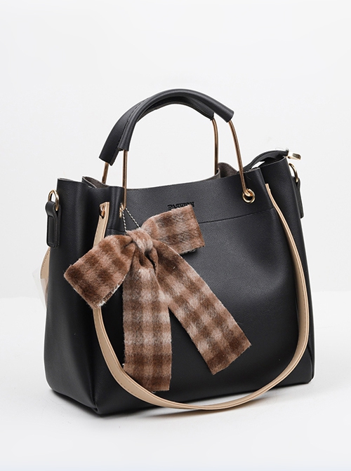 Solid Color Large-Capacity All-Match One-Shoulder Bucket Bag Plaid Bowknot Decoration Classic Lolita Bag