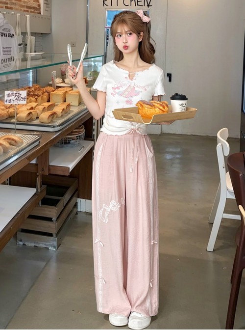 Spring Summer Kawaii Fashion Loose Comfortable Soft Girl Sweet Pink Bowknot Lace Casual Pants