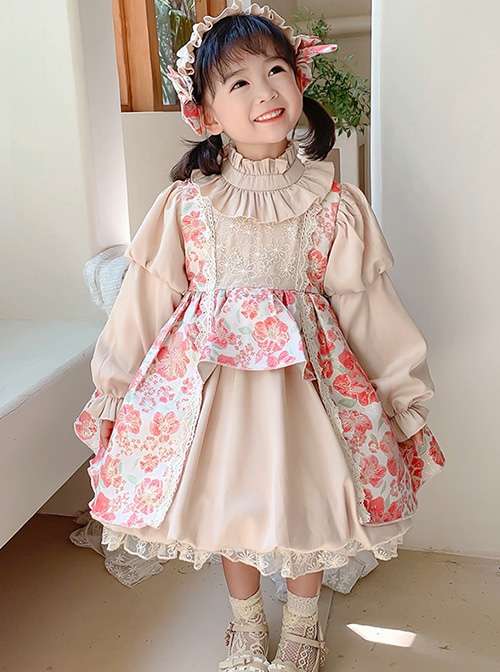 Stand Collar Spring Autumn Flower Print Court Style Puff Sleeves Big Bow-Knot Sweet Lolita Kids Long-Sleeved Dress