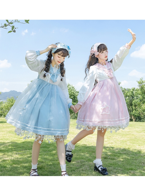 Starlet Island Series OP Navy Collar Star Lace Hem Sweet Lolita Long Sleeve Dress