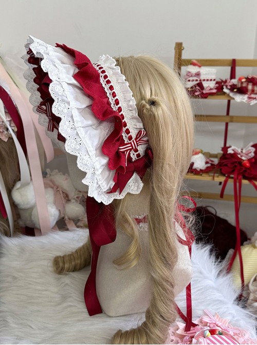 This Sweet Lolita bonnet features red-and-white lace and cotton fabric with ruffled edges, perfect for adding a touch of elegance and sweetness to your outfit.