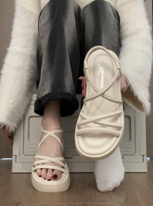 Summer Daily Versatile Gentle Elegant Vacation Classic Lolita Thick Sole PU Roman Ribbon Straps Sandals