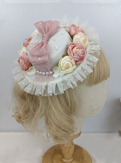 Sweet And Cute Pleated Lace Three-Dimensional Flower Decoration Bow Knot Pearl Classic Lolita Hat