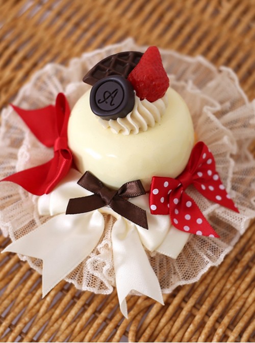This Sweet Celebration Series hair clip features adorable simulation cream cakes, fruit biscuits, and chocolate decorations. It's embellished with a cute bowknot and delicate lace, making it a perfect kawaii accessory for any sweet Lolita outfit.