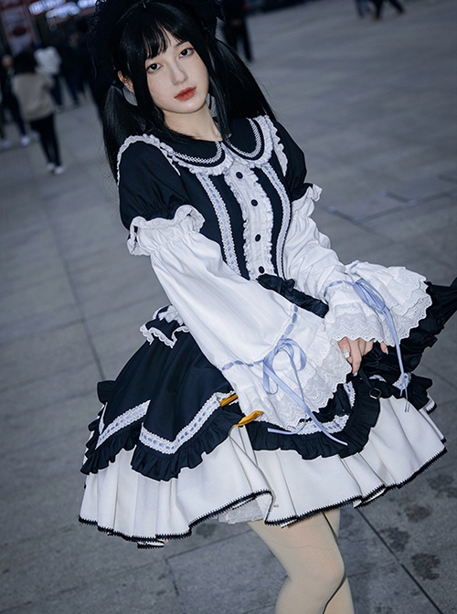 Cute doll collar, irregular petal hem, black and white contrast detachable sleeve design, suitable for many seasons