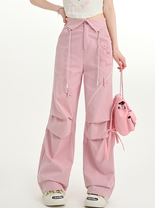 Sweet Spicy Girl Style Kawaii Fashion Casual Camping Sports Daily Commute High Waist Pink Wide Leg Straight Overalls