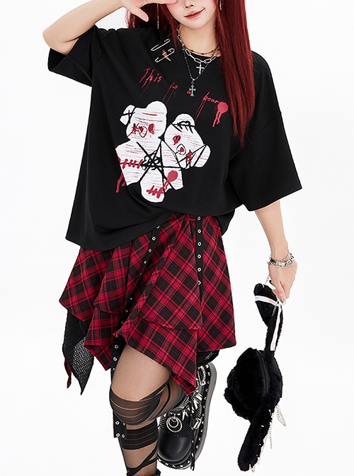 Trial Record Series Dark Punk Hottie Subculture Y2K Irregular Spliced Black Belt High Waist Red Black Plaid Skirt