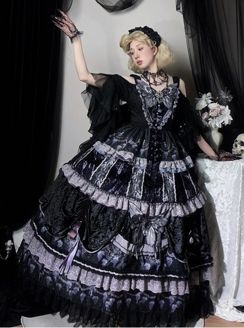 Twilight Manor Series Elegant Classic Lolita Black Purple Gorgeous Noble Butterfly Ruffle Long Off Shoulder Dress Set