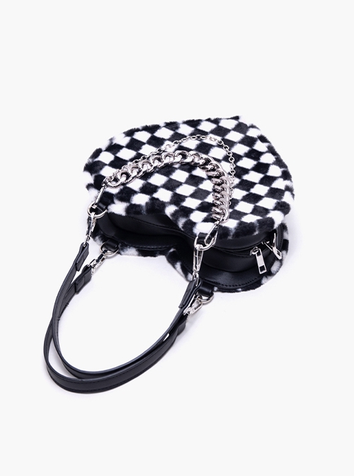 Unique Black White Checkerboard Design Soft Plush Metal Chain Decoration Heart Shape Kawaii Fashion Bag