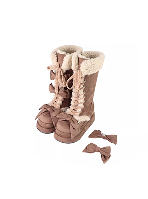 Warm Cake Series Lambswool Cute Straps Shoelace Bowknot Sweet Lolita Thick Sole Snow Long Tube Boots
