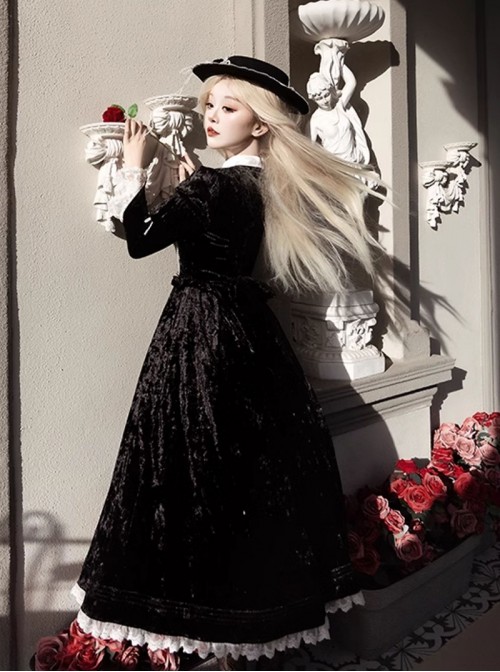 Whispering Castle Series Elegant Gothic Lolita Black Noble Ruff Collar Long Sleeve Dress Cloak Pearl Bonnet Hat Set