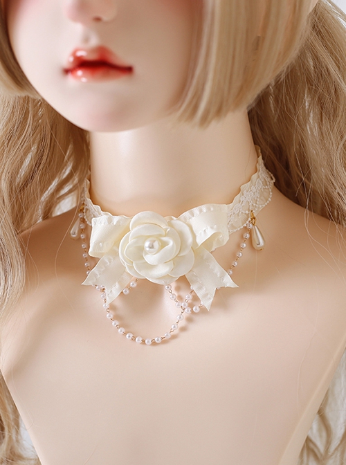 White Bowknot Flower Lace Bead Chain Decoration Daily All-Match Classic Lolita Necklace